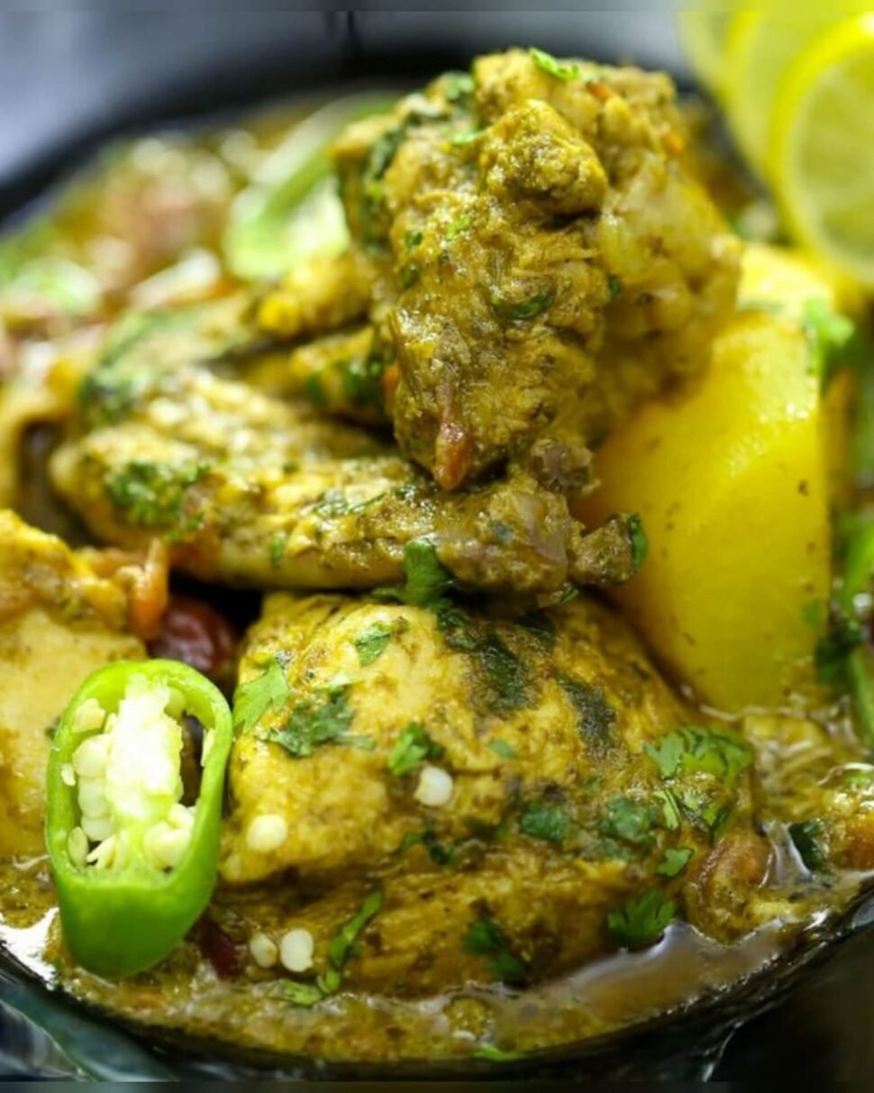 Fresh, herby green chicken curry with potatoes—packed with coriander, mint, and bold Indian flavors.