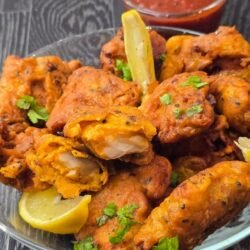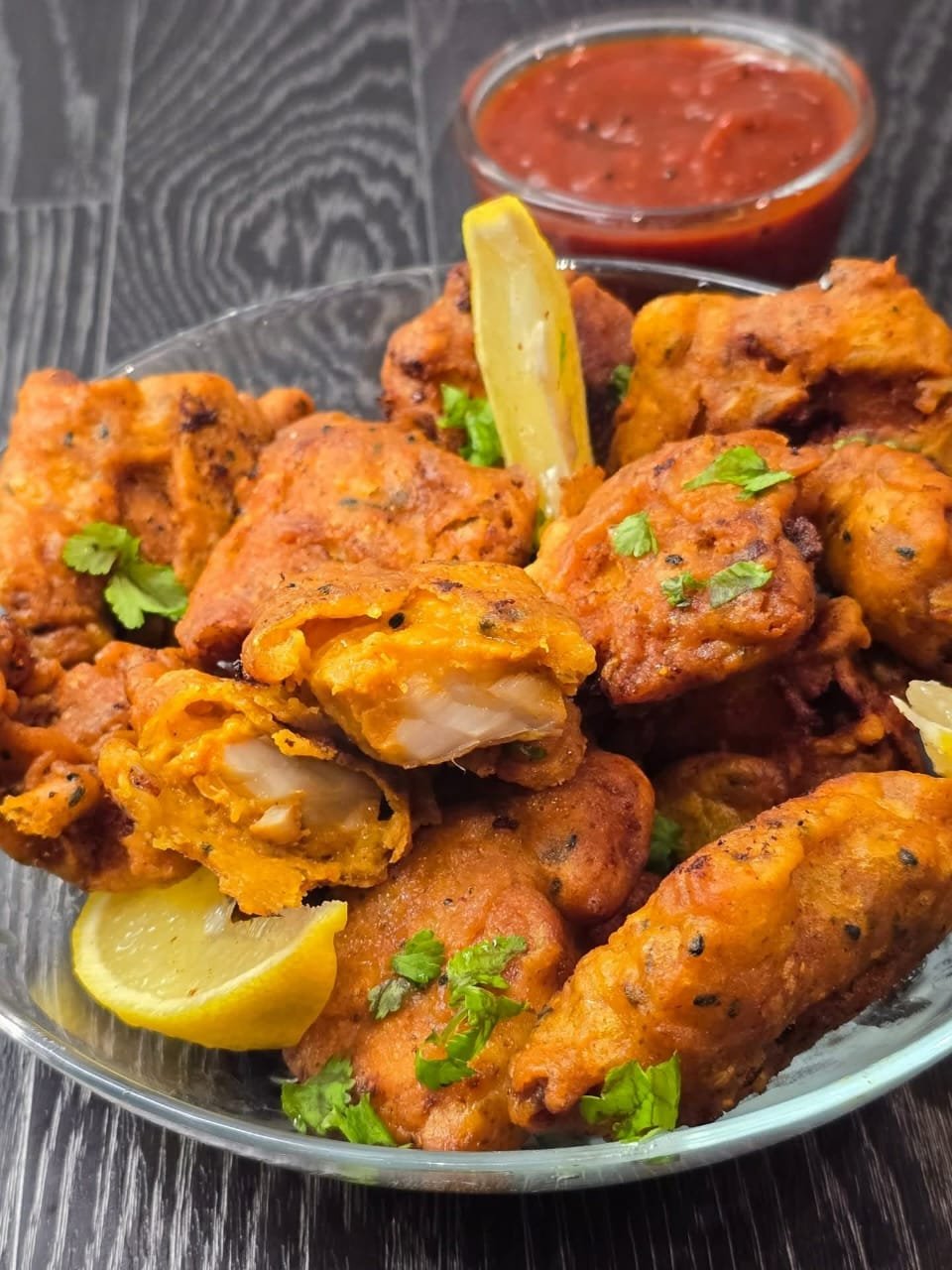 Crispy deep-fried fish fritters coated in a spiced gram flour batter, perfect as a crunchy tea-time snack or starter.