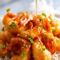A quick and flavorful seafood dish with juicy prawns coated in a sweet, sticky honey garlic sauce.
