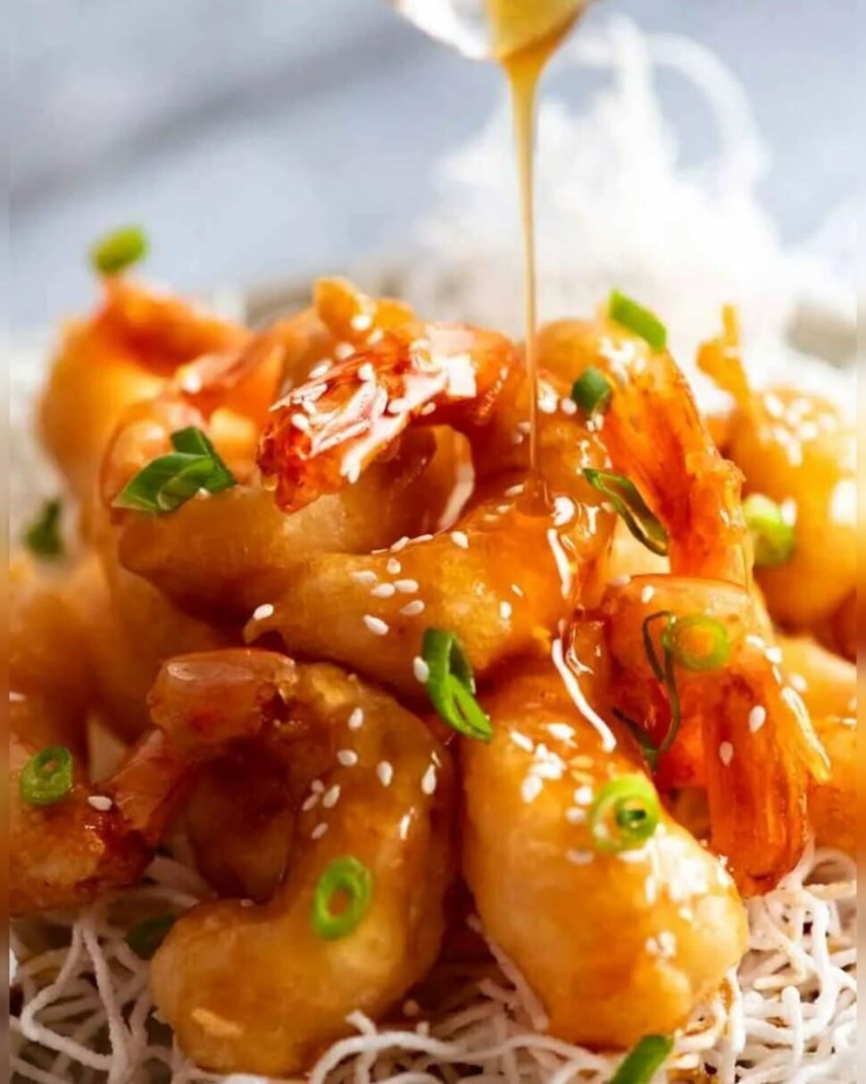 A quick and flavorful seafood dish with juicy prawns coated in a sweet, sticky honey garlic sauce.