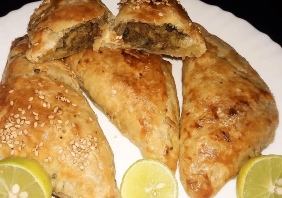 A flaky baked pastry filled with savoury minced meat, onions, and spices, popular as a snack or street food in Kenya.