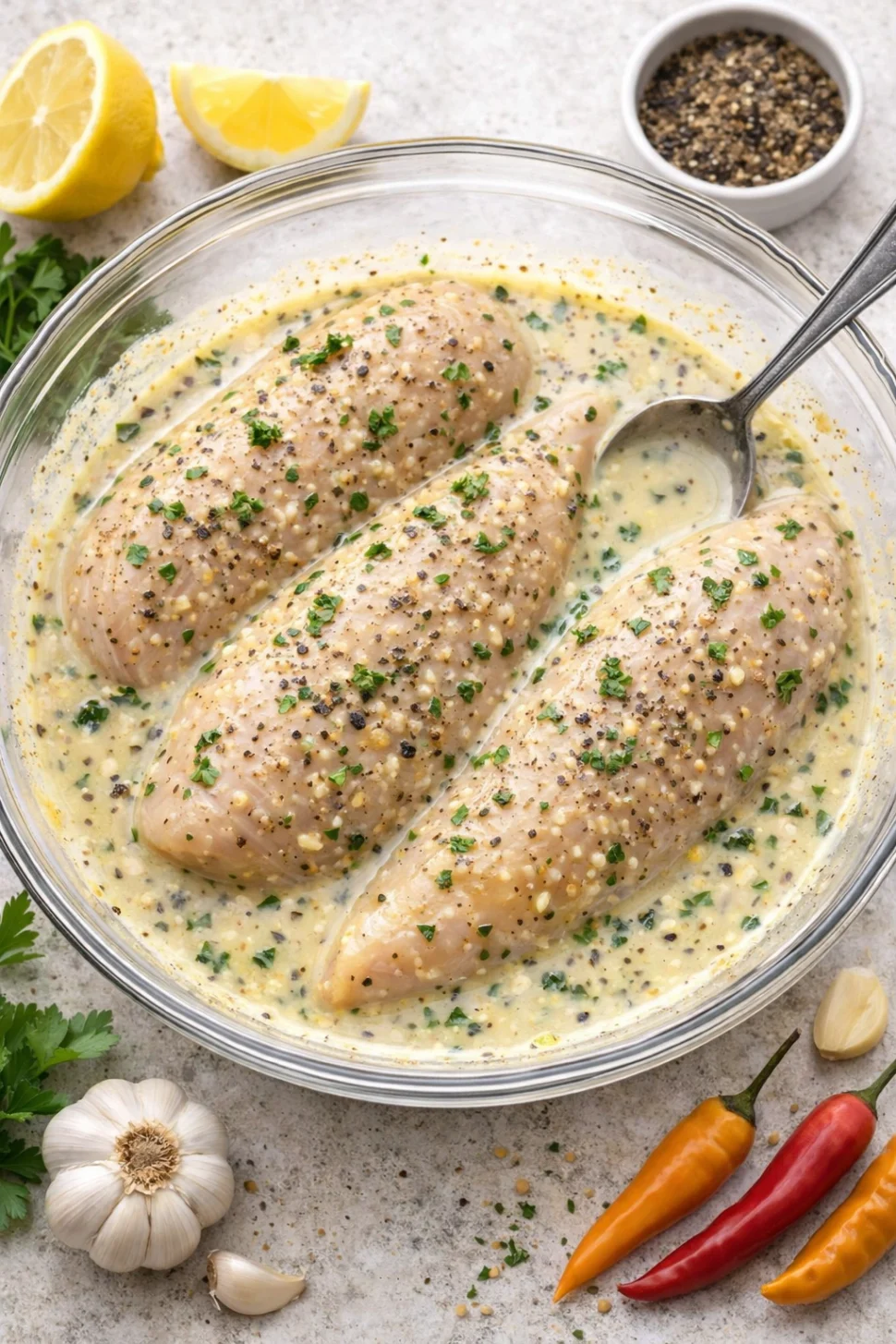 - Remove marinated chicken from the fridge and let it rest at room temperature for 10–15 minutes.
