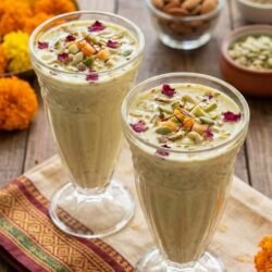 - Pour the chilled Thandai into glasses and garnish with sliced pistachios, almonds, rose petals, and saffron strands.